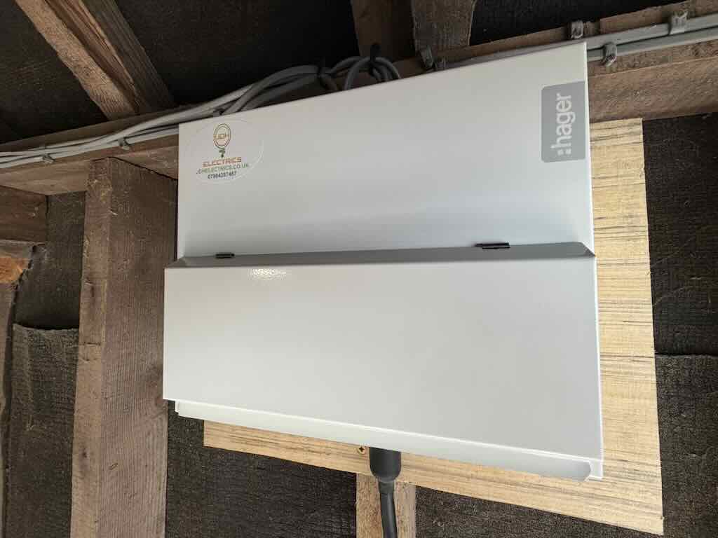 EICR & Consumer Unit Upgrade in Bury St Edmunds - old fuse boardEICR & Consumer Unit Upgrade in Bury St Edmunds - new Hager Garage consumer unit