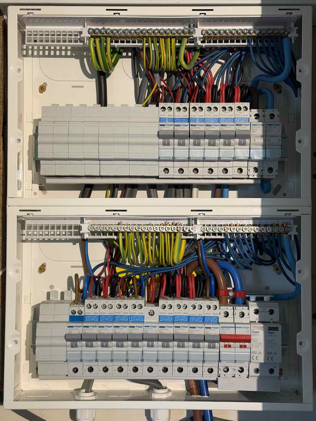 EICR & Consumer Unit Upgrade in Bury St Edmunds - old fuse boardEICR & Consumer Unit Upgrade in Bury St Edmunds - new Hager Double Stack consumer unit